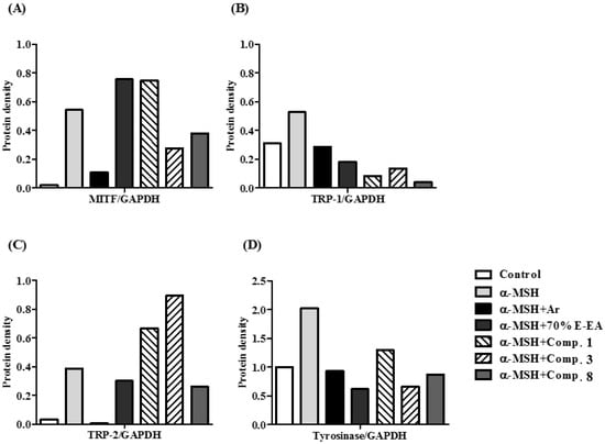 Effects on melanogenesis-related protein expression in α-MSH-induced murine B16-F10 cells; B16-F10 cells were pretreated with test samples for 2 h and α-MSH was added to the cells for 24 h. Glyceraldehyde 3-phosphate dehydrogenase (GAPDH) was used as the control protein. The protein levels of microphthalmia-associated transcription factor (MITF), tyrosinase, tyrosinase-related protein-1 (TRP-1), and tyrosinase-related protein-2 (TRP-2) were detected by Western blot analysis. Compounds 3 and 8 significantly reduced the expression of MITF, tyrosinase, TRP-1, and TRP-2 in α-MSH-induced B16-F10 cells. Arbutin, a positive control drug, also blocked the melanogenesis. (A) MITF, (B) TRP-1, (C) TRP-2, and (D) tyrosinase were analyzed and quantified using Azure Spot software. MITF, TRP-1, TRP-2 and tyrosinase protein levels were normalized by GAPDH.