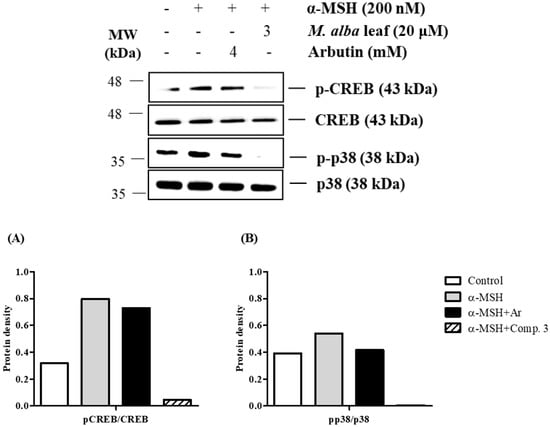 Effects of M. alba leaves on the phosphorylation of the cAMP-responsive element-binding protein (CREB) and p38 in α-MSH-induced B16-F10 cell; B16-F10 cells were pretreated with test samples for 2 h and α-MSH was added to the cells for 24 h. Total protein was used as the control protein. The protein levels of pCREB, CREB, pp38, p38 were detected by Western blot analysis. Compound 3 significantly reduced the expression of pCREB and pp38 in α-MSH-induced B16-F10 cells. Arbutin, a positive control drug, also blocked the melanogenesis. The protein level of (A) pCREB and (B) pp38 were quantitated with Azure Spot software. pCREB and pp38 protein levels were normalized by the total protein of CREB or p38.
