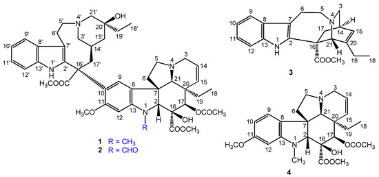 The alkaloids vinblastine (1), vincristine (2), catharanthine (3) and vindoline (4).
