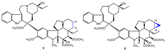 It is interesting to note that relatively minor changes in the bisindole structure can result in major changes in the biological activity. For example, one of the simplest such modification is the catalytic hydrogenation of the olefinic bond in the vindoline part of VLB (1), leading to 14,15-dihydrovinblastine (5), whose antitumor activity is significantly lower than that of VLB (1) (Figure 2) [13]. On the other hand, if instead of only being saturated, there is also a methylene bridge connecting C-14 and C-15, the resulting compound’s bioactivity changes dramatically. In our previous work [14,15,16] we synthesized different kinds of bisindole alkaloids condensed with a cyclopropane ring at position 14,15 of the vindoline part, namely cyclopropanovinblastine (6), cyclopropanovincristine, cyclopropanovinorelbin, and other derivatives. We reported their significant tumor cell inhibiting activity on different tumor types and tumor cell lines.