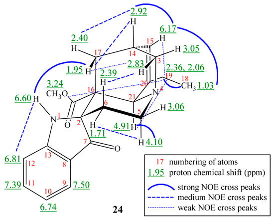 The stereogenic centers of 24 are C-2, N-4, C-14, C-16 and C-21 (Figure 3). Since 24 has a rigid cage structure (2-azabicyclo[2.2.2]octane) condensed with a six-membered ring, the relative configurations of N-4, C-14, C-16, and C-21 are fixed (the configuration at C-21 can be arbitrarily established as R, then N-4, C-14, and C-16 must be R,R,R). With this in mind, the configuration of C-2 was determined as follows. The NOESY correlation between NH-1 (6.60 ppm) and one of the protons at C-17 (1.95 ppm) implies that the configuration of C-2 is R (otherwise we would expect correlations between NH-1 and the protons at C-5), and the actual three-dimensional structure is supported by several other NOESY correlations (Figure 3).