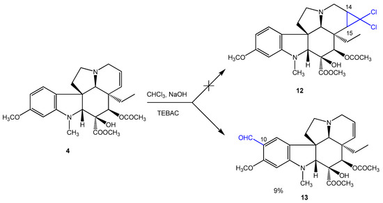 First, the classical method of the reaction of dichlorocarbene with alkenes [19] was tried on vindoline (4) as a model compound (Scheme 2). A chloroform solution of vindoline (4) was treated with an aqueous solution of sodium hydroxide at room temperature in the presence of the phase transfer catalyst benzyltriethylammonium chloride (TEBAC). Unexpectedly, the dichlorocyclopropano derivative (12) could not be detected in the reaction. However, a formyl group was built in at position 10, resulting in 10-formylvindoline (13), a compound that is already known in the literature [20,21,22].