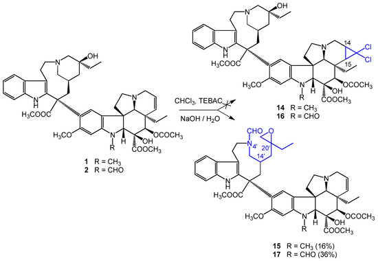 The above-mentioned dichlorocarbene reaction on the dimeric alkaloids vinblastine (1) and vincristine (2) was also investigated. In these reactions, instead of the expected dichlorocarbene adducts 14 and 16, interesting ring-opened oxirane derivatives (15 and 17) were isolated in various yields (Scheme 3).