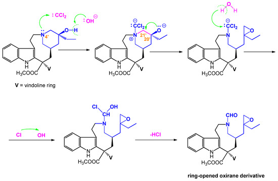 A plausible interpretation of the oxirane formation is outlined in Scheme 4 (where V can represent non-modified and different kinds of modified “vindoline” units as well). First, electrophilic dichlorocarbene attacks the nucleophilic tertiary amine nitrogen at position 4’, leading to an ammonium compound as the intermediate. Then the hydroxyl group at C-20’ might become deprotonated under basic reaction conditions, the anionic moiety attacks C-21’, and N-4’ is neutralized during a heterolytic cleavage of a carbon-nitrogen bond. Finally, one of the chloro groups may undergo substitution with OH, and a formyl group forms by the elimination of hydrogen chloride.
