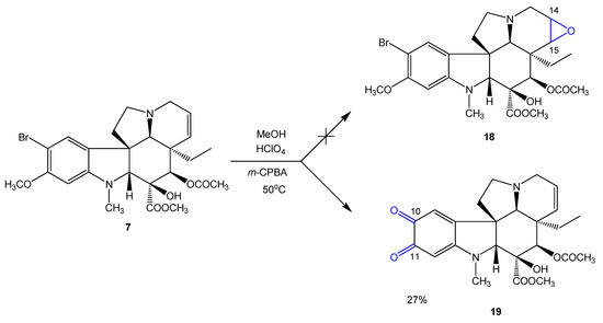 First, the oxidation of 10-bromovindoline (7) with m-chloroperoxybenzoic acid (m-CPBA) was studied. The reaction could be performed either in the presence or absence of perchloric acid, which may influence the outcome of the oxidation [25]. When carrying out the reaction in methanol without HClO4, none of the oxidated products could be isolated. Surprisingly, when HClO4 was used in the reaction, the debromination and demethylation at the aromatic ring occurred. An o-quinoidal compound (19) was isolated in 27% yield, but the desired oxirane 18 could not be obtained (Scheme 5). Starting from compound 19, the reaction has been described in a short article published last year by us [26].