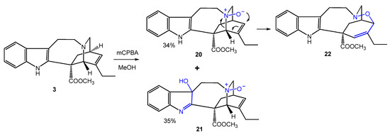 Hereafter the above-mentioned two methods of oxidation with m-CPBA were also tried on catharanthine (3). In the absence of perchloric acid, the oxidation led to a mixture of two products: catharanthine N4-oxide (20) in 34% yield (a similar preparation of 20 is known from the literature [18]), and a new compound (N4-oxide of 7-hydroxyindolenine catharanthine, 21) in 35% yield (Scheme 6).