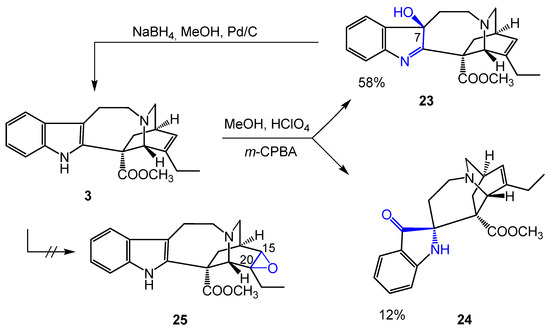 3.11. Reduction of the 7-Hydroxy Derivative of Catharanthine (23)