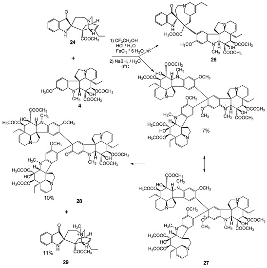 Instead of the desired bisindole 26, only unexpected products were found in the reaction mixture. We encountered that vindoline coupled to itself: a cationic trimeric vindoline (27) and a trimeric vindoline ketone (28) were isolated. The presence of a third product, N-methyl quaternary salt of a spiro derivative 29 suggests that the role of the spiro derivative 24 in the reaction might be the demethylation of the mesomer 27. To support our assumption, the reaction was repeated without adding the spiro derivative of catharanthine (24). This way, only O-methylated trimeric vindoline (27) could be isolated and ketone 28 was not found in the reaction mixture, which substantiates our hypothesis.