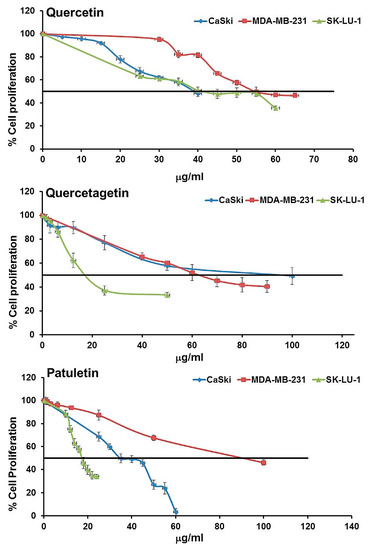 To determine the concentration of flavonols required to inhibit the proliferation of CaSki, MDA-MB-231 and SK-Lu-1 by half (IC50), 7500 cells were cultured for 24 h with 6, 12, 25, 50 and 100 μg/mL of quercetin, quercetagetin or patuletin. After 24 h, the number of cells was evaluated using crystal violet staining (Figure 4, Table 2).