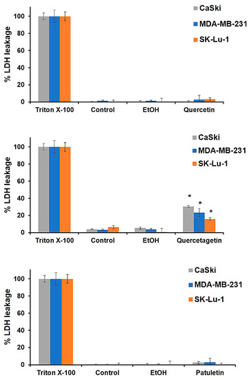 LDH activity induced by quercetin, quercetagetin and patuletin on CaSki, MDA-MB-231 and SK-Lu-1 cultures. In each case, 7500 cells/well were seeded in 96-well tissue culture plates. After 24 h, the medium was removed, and the cells were stimulated with the IC50 values for quercetin, quercetagetin and patuletin, or EtOH (10 μL/mL). The amount of lactate dehydrogenase (LDH) released into the culture supernatant was measured after 24 h of treatment. Experimental data are presented as mean ± S.D. for three independent experiments with three repetitions. * p < 0.05 versus EtOH (ANOVA followed by a Tukey’s test).