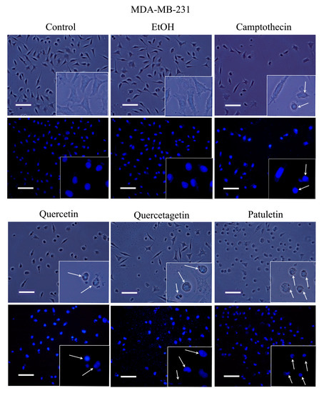 Morphology and DAPI staining. MDA-MB-231 cell cultures were exposed to quercetin, quercetagetin and patuletin at the aforementioned IC50 values. Camptothecin was used as a positive control for apoptosis. The phase-contrast images evidenced cellular shapes under the different experimental conditions. The control and EtOH cells had extended cytoplasm with chromatin distributed in the nuclear space, as shown by the fluorescent distribution of DAPI. After treatment, both the cytoplasm and nucleus were contracted, and several apoptotic bodies were visible (arrows), Scale bars 100 microns.