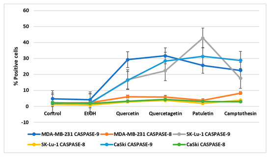 Active caspase-9 and active caspase-8 were also present in the treated cancer cells, though the numbers of cells positive to caspase-9 detection were significantly higher than those that were positive to caspase-8 (Figure 11). This finding suggests that quercetin, quercetagetin and patuletin induce the apoptotic process through the intrinsic apoptotic pathway (see Supplementary Material).