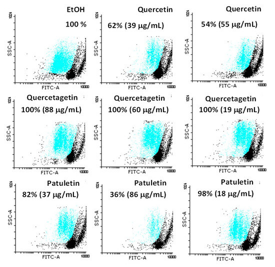 Cells treated only with the vehicle only were used as an experimental control (EtOH). They showed 100% proliferation (Figure 12); however, when the lymphocytes were treated at the aforementioned IC50 values of the compounds their behavior differed, as the proliferative potential of lymphocytes was negatively-affected by treatment with 86 μg/mL of patuletin. The treatment with quercetin affected all the cells evaluated in a proportion of approximately 50%. In contrast, quercetagetin did not affect the proliferation activity of the lymphocytes.
