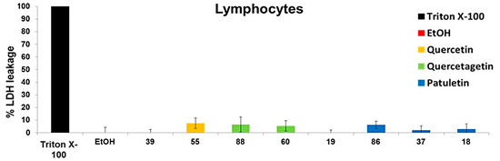 To determine the necrotic effect of different flavonoids on normal cells, human lymphocytes were induced to proliferate by phytohemagglutinin for 72 h, and the amount of LDH released into the media was measured. The percentage of LDH released after treating the lymphocytes with quercetin, quercetagetin and patuletin was below 8%. Upon comparing this percentage to the amount released by the tumor cells, it was determined that the necrotic effect inside non-tumor cells was not significant. Our results show that treatment with the compounds evaluated—quercetin, quercetagetin and patuletin—did not cause any necrotic effect in the lymphocytes. This result is suggestive of a selective effect of quercetin, quercetagetin and patuletin in non-tumor cells (Figure 13).