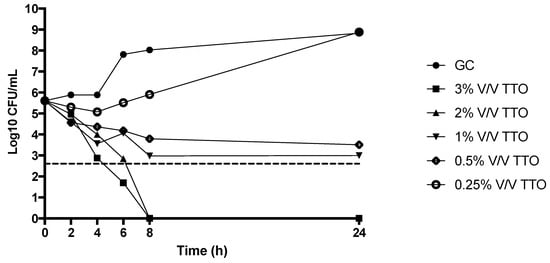 Activity of TTO against MRSA at different concentrations throughout killing study. GC: Growth Control; MRSA: Methicillin-resistant Staphylococcus aureus. Dashed line represents bactericidal activity.