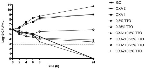 Activity of TTO (v/v) and OXA (μg/mL) at different concentrations against MRSA throughout killing study. GC: Growth Control; MRSA: Methicillin-resistant Staphylococcus aureus; OXA: oxacillin. Dashed line represents bactericidal activity.