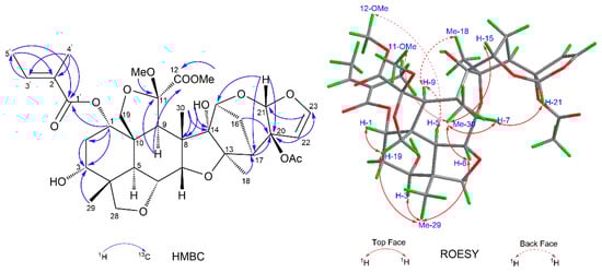 Toosendane C (limonoid 3) was isolated as a colorless, amorphous powder. Its molecular formula was C34H44O13, deduced from the HRESIMS spectrum at m/z 683.2673 [M + Na]+ (C34H44NaO13, calculated as 683.2674) (see Supplementary Materials). The NMR spectra were similar to those of limonoid 2, except for an O-methacrylate group (δH 6.13, s; 5.62, t, J = 1.6 Hz; 1.96, br s; δC 166.5; 136.4; 126.2; 18.3) replacing the 3-tigloyloxyl group of limonoid 2. This conclusion was further confirmed by the following key HMBC correlations: H-3’ (δH 6.13, s)/C-2’ (δC 136.4) and C-1’ (δC 166.5), Me-4’ (δH 1.96, br s)/C-1’ (δC 166.5), C-2’ (δC 136.4) and C-3’ (δC 126.2), and Me-29 (δH 0.98, s)/C-3 (δC 71.3). The relative configuration of limonoid 3 was determined to be the same as that of limonoid 2, through its similar ROESY spectrum. The absolute configuration of limonoid 3 could not be determined, based on current information. On the basis of these results, the structure of limonoid 3 was identified and represented in Figure 1.