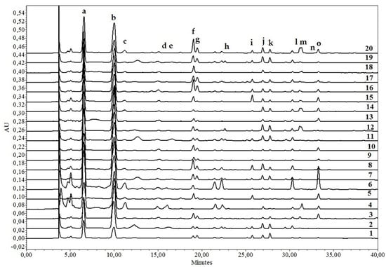Phenolic compound profiles of different Sorbus fruit powder samples. a—neochlorogenic acid; b—chlorogenic acid; c—cryptochlorogenic acid; d—caffeoylshikimic acid; e—coumaroylquinnic acid derivative; f—quercetin dihexoside1; g—quercetin dihexoside2; h—quercetin dihexoside3; i—rutin; j—hyperoside; k—isoquercitrin; l—quercetin malonylglycoside; m—isorhamnetin rutinoside; n—astragalin; o—dicaffeoylquinnic acid. 1–‘Alaja Krupnaja’; 2—‘Burka’; 3—‘Businka’; 4—‘Dodong’; 5—‘Esseziani’; 6—‘Fructo Lutea’; 7—‘Granatnaja’; 8—‘Kirsten Pink’; 9—‘Konzentra’; 10—‘Krasnaja Krupnoplodnaja’; 11—‘Likernaja’; 12—‘Miciurinskaja Desertnaja’; 13—‘Nevezinskaja’; 14—‘Pendula Variegata’; 15—‘Red Tip’; 16—‘Rosina Variegata’; 17—‘Rubinovaja’; 18—‘Sorbinka’; 19—‘Titan’; 20—‘White Swan’.