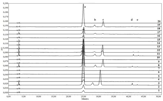Anthocyanin compound profiles of different Sorbus fruit powder samples. a—cyanidin 3-O-galactoside; b—cyanidin 3-O-glucoside; c—cyanidin 3-O-arabinoside; d—peonidin 3-O-arabinoside; e—Malvidin 3-O-arabinoside. 1—‘Alaja Krupnaja’; 2—‘Burka’; 3—‘Businka’; 4—‘Dodong’; 5—‘Esseziani’; 6—‘Fructo Lutea’; 7—‘Granatnaja’; 8—‘Kirsten Pink’; 9—‘Konzentra’; 10—‘Krasnaja Krupnoplodnaja’; 11—‘Likernaja’; 12—‘Miciurinskaja Desertnaja’; 13—‘Nevezinskaja’; 14—‘Pendula Variegata’; 15—‘Red Tip’; 16—‘Rosina Variegata’; 17—‘Rubinovaja’; 18—‘Sorbinka’; 19—‘Titan’; 20—‘White Swan’.