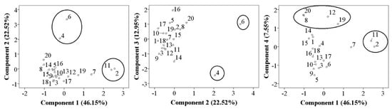 PCA score plots of different Sorbus fruit powder samples. 1—‘Alaja Krupnaja’; 2—‘Burka’; 3—‘Businka’; 4—‘Dodong’; 5—‘Esseziani’; 6—‘Fructo Lutea’; 7—‘Granatnaja’; 8—‘Kirsten Pink’; 9—‘Konzentra’; 10—‘Krasnaja Krupnoplodnaja’; 11—‘Likernaja’; 12—‘Miciurinskaja Desertnaja’; 13—‘Nevezinskaja’; 14—Pendula Variegata’; 15—‘Red Tip’; 16—‘Rosina Variegata’; 17—‘Rubinovaja’; 18—‘Sorbinka’; 19—‘Titan’; 20—‘White Swan’.