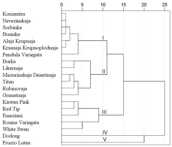 After hierarchical cluster analysis, the rowanberry fruit samples were grouped into five clusters (Figure 4). Statistically significant differences were revealed among these five clusters. The first cluster was comprised exclusively of S. aucuparia cultivars. The fruit samples of this cluster were distinguished by one of the highest total content of sugars and by the lowest total contents of organic acid, phenolic acids and flavonoids. The second cluster was comprised exclusively of Sorbus hybrids. The fruit powder samples ascribed to the second cluster accumulated the highest content of anthocyanins, sugars, and the lowest content of carotenoids and phenolic acids. The third cluster was comprised of fruit powder samples of Lombart’s hybrid (‘Kirsten Pink’, ‘Red Tip’, ‘White Swan’), ‘Esseziani’ and ‘Rosina Variegata’. In the fruit powder samples of these cultivars one of the highest total content of flavonoids and one of the lowest contents of anthocyanins, carotenoids and sugars were determined. To the fourth cluster, only ‘Dodong’ was attributed, which distinguished by the highest total content of carotenoids, sugars, and one of the lowest total contents of flavonoids and organic acids. The fifth cluster was comprised exclusively from ‘Fructo Lutea’. The fruit powder samples of this cultivar were distinguished by the highest total contents of phenolic acids, organic acids and notable amounts of carotenoids.