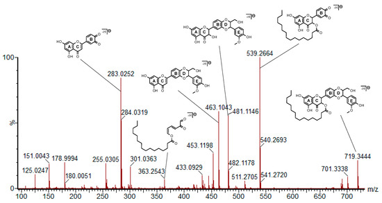 Electrospray ionization with high-resolution mass spectrometry (ESI-HRMS/MS) spectrum of the [M-H]− precursor ion at m/z 719 corresponding to 2 recorded at 33 eV with hypothetic structures for the main fragments.