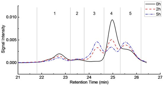 The molecular size distribution of water-soluble polysaccharides in longan juice before (0 h) and after enzyme treatment for 2 and 5 h were characterized by Gel Permeation Chromatography (GPC), and the results are shown in Figure 2. All distributions were normalized to achieve the same area under each curve. Therefore, impacts of differences in sample concentration on the distribution curve were eliminated. Five peaks were observed in the molecular size distribution of all the three samples, with peak maximums exhibited at 22.7, 23.5, 24.3, 24.9 and 25.5 min respectively, meaning five fractions present in each sample. Area under each peak was calculated to represent the relative proportion of each fraction, with results exhibiting in Table 4.