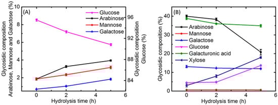 Glycosidic composition and corresponding molar percentages during the hydrolysis developing from 0 h to 5 h. (A), the water-soluble polysaccharide; (B), the insoluble fiber.