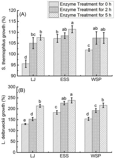 The enzyme treated longan juices (LJ) (enzyme treated for 0, 2 and 5 h), their ethanol-soluble sugar (ESS) fraction and water-soluble polysaccharide (WSP) fraction were used to study their impacts on the stimulation of lactobacilli in vitro, and the results are shown in Figure 4. After 48 h of incubation, the maximum growth of L. delbrueckii, S. thermophiles and L. acidophilus was observed. The growth rate values obtained at 48 h were accepted for further statistical analyses, respectively.