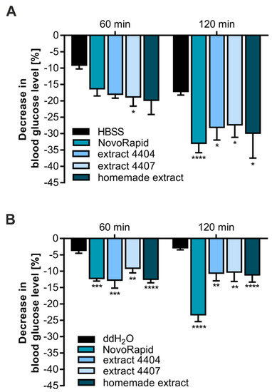 Influence of extracts prepared from bellis perennis on blood glucose levels in ovo. Eggs were incubated for 11 days and treated with the indicated substances (NovoRapid: 3.3 U/mL; extracts: 300 mg/L) dissolved in HBSS buffer (A) or ddH2O (B) (300 μL volume) for up to 2 h. Blood glucose levels were determined with a blood glucose meter. Error bars are based on the standard error of the mean. * p < 0.05, ** p < 0.01, *** p < 0.001 and **** p < 0.0001, with a significant decrease with respect to HBSS or ddH2O treated eggs of the same incubation time.