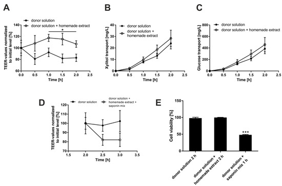 Effects of the home-made bellis perennis extract on epithelial membrane integrity. Caco-2 cells were grown on collagen-coated 0.4 µm transwell inserts for monolayer formation and fast differentiation. On day 5, glucose and xylitol transport across the cell monolayer was quantitated. Cell culture medium with 13.5 g/L glucose and 1.0 g/L xylitol was placed as donor solution in the apical compartment. Samples were collected from the basolateral compartment (HEPES buffer) at the respective time points. Glucose and xylitol concentrations of the samples were measured by high-performance liquid chromatography (HPLC). Influence of the extract (A) and the extract in combination with a saponin mix (D) on the membrane integrity as evaluated by transepithelial electrical resistance (TEER) measurements. Effect of the extract on the cumulative xylitol (B) and glucose (C) transport from the apical to the basolateral side of Caco-2 monolayers. (E) Influence of the used formulations on cell viability. Error bars are based on the standard error of the mean (n = 6 inserts, measured on two different days). * p < 0.05, *** p < 0.001.