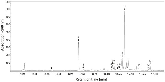 HPLC-diode array detector (DAD) chromatogram of home-made Bellis perennis extract recorded at 260 nm. For peak numbers, refer to Table 1.