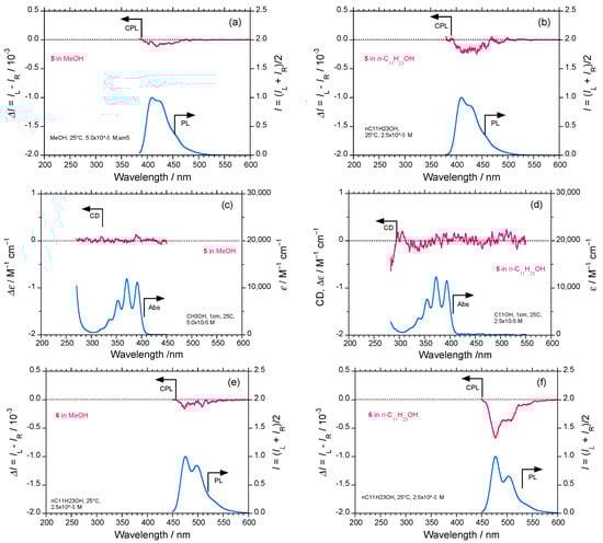 On the other hand, pseudo-D2h symmetrical frameworks bearing rotatable phenyl groups and phenylethynyl groups (5–9, Chart 2) showed (–)-sign CPL signals at the corresponding PL bands in methanol and other solvents (Figure 2 and Figure S1 Supplementary Materials (SM)). Molecules 5 and 6, corresponding to 1 bearing two phenyl groups and two phenylethynyl groups in the 9,10-positions, respectively, showed weak vibronic CPL bands in methanol (Figure 2a,e). Evidently, the CPL signals of 5 and 6 are significantly boosted in the more viscous solvents n-undecanol (16.95 cP) and 1,4-butanediol (71.0 cP) (Figure 2b,f and Figure S1a in SM)).