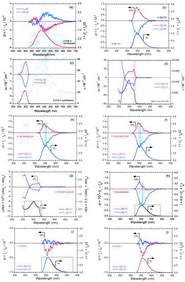 The rigid luminophores, D-10/L-10, in cyclohexane revealed ideal mirror image profiles of vibronic CD and non-vibronic bisignate CPL spectral line shapes with opposite sign and equal magnitude (Figure 3a,c) [70,71]. Similarly, R-11/S-11 in lower viscosity solvents (n-pentane (0.21 cP), methanol (0.55 cP) and chloroform (0.55 cP)) revealed mirror image vibronic CD and vibronic CPL spectral profiles with opposite sign and equal magnitude (Figure 3b,d and Figure S2a,b in SM). Thus, the CPL and CD spectrometers afford reliable evidence for the measurement of ideal mirror-image CD and CPL spectral sets between enantiomers of rigid chiral emitters in lower viscosity solvents at the S1 and S0 states. However, R-11/S-11 in higher viscosity solvents (ethylene glycol (16.1 cP), 1,3-propanediol (33.0 cP) and 1,4-butanediol (71.0 cP)) [64] revealed non-mirror image CPL spectra (Figure 3e,f,h). As the viscosity increased from 16 to 71 cP, the absolute magnitude of the CPL of (R)-11 at ~350 nm weakens. Moreover, CPL λext wavelengths (pink and sky-blue bars) between (R)- and (S)-11 progressively tended to differ from each other. Noticeably, the corresponding CPL spectra between (R)- and (S)-11 in 1,4-butanediol differ significantly from each other, indicating the absence of enantiomers in the S1 state (green box in Figure 3h). Also, the corresponding UV-visible spectra of (R)- and (S)-11 in ethylene glycol differ from each other, indicating the absence of enantiomers in the S0 state (green box in Figure 3g).