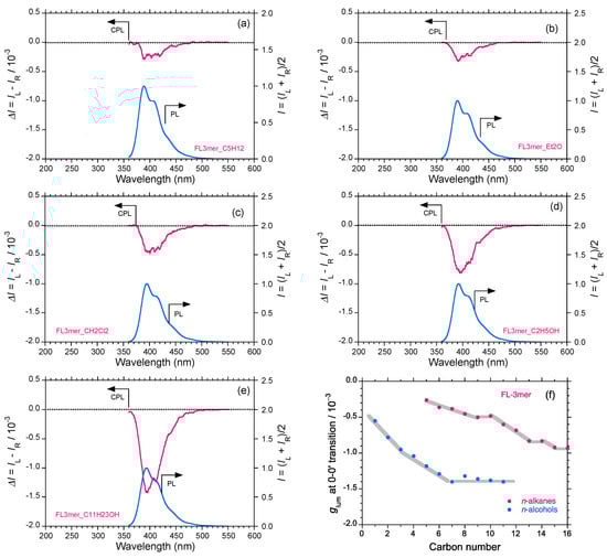 CPL/PL spectra of FL2-C3 (Exalite 384, fluorene dimer) excited at 315 nm at room temperature (a) in methanol, (b) in n-undecanol and (c) in squalene; (d) the glum value at 0-0’ band of FL2-C3 as a function of carbon numbers in two series of n-alkanes and n-alkanol including methanol and ethanol; (e) the glum value at the 0-0’ band of FL2-C3 (Exalite 384) as a function of viscosity (in cP at 20–25 °C) in various achiral alkanes, alkanols and other solvents and (f) magnification of the viscosity region 0–10 cP. Path length: 10 mm, cylindrical cuvette, conc.: 1 × 10−5 M.