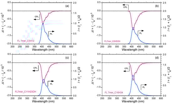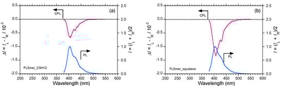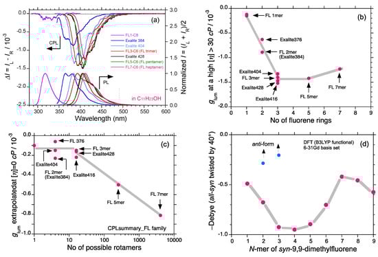 To this end in the study of the chiroptical characteristics in the fluorene family at the S1 state, we compared the CPL and PL spectra of FL1-C8, Exalite 384, Exalite 404, Exalite 428, FL3-C6, FL3-C6, FL5-C6 and FL7-C6 dissolved in n-undecanol (16.95 cP) in Figure 13a. The λext peak wavelength of the vibronic luminescence bands at the 0-0′ transition progressively redshifted as the fluorene ring number increased from one to seven. The magnitude of the CPL signal, ∆I = IL − IR, increased when the ring number was greater than three (regarding Exalite 404 as a fluorene trimer).