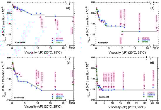 This tendency led us to plot the glum value as a function of solvent viscosity using thirty-two kinds of molecular liquids, including twelve alkanes (linear and branched), eighteen alcohols (linear, branched and cyclic) and chloroform (Figure 8e,f)). The glum value increased but underwent a discontinuous step-like transition when [η] = 4–9 cP and 11–30 cP (Figure 8e). The glum value increased almost linearly in response to solvent viscosity when [η] was in the range 0.21 (n-pentane) to [η] = 4.59 (n-hexanol) (Figure 8e,f).