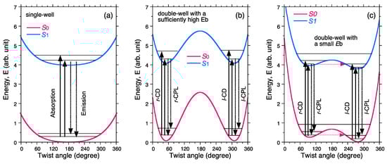 The handed electron–nuclei interactions force enables CPL-silent/CD-silent molecules into CPL-active/CD-active ones at the S1/S0 states. Although heavier atoms, like Si, Ge, Sn, Pb, Se, Te, Fe, Ru, Re, W, Os and U, are involved in the luminophores, EPV may be boosted by the VSO (∝ Z2) law. However, luminescent species might be phosphorescent with an inefficient quantum yield (PLQY, typically, <0.01) and is difficult to detect as CPL/PL signals in an excellent S/N ratio. Therefore, we focused on fluorophores comprising lighter atoms because of an efficient PLQY, typically, 0.1–0.9. The values of the spin-orbit interaction (ζ) for lighter atoms (C, N, O, F, S) are considerably large ζ values such that 0.1, 0.2, 0.4, 0.7, 1.0 kcal mol−1, respectively [66]. These fluorophores are utilized as laser dyes, highly emissive dyes, biomarkers and scintillators. If huge numbers (>1010–1016) of the non-rigid enantiomeric fluorophores in a cuvette are photoexcited macroscopically and simultaneously, the ultra-tiny ee or faint EPV of an isolated molecule may be greatly boosted to the detectable level, according to the linear amplification model [28] and/or the highly cooperative phase transition models at the far-from, non-equilibrium, open-flow S1 state [41].