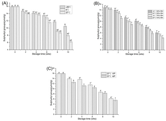 Changes in the free sulfhydryl content of PPI stored at different temperature (A), relative humidity (B) and packaging methods (C). a–f means the significant difference between the same treatments with different weeks (p < 0.05). 1–3 means the significant difference between the same weeks with different temperature (A) (p < 0.05) * means the significant difference between the same weeks and temperature with different relative humidity (B) or between the same weeks with different packaging methods (C) (p < 0.05).
