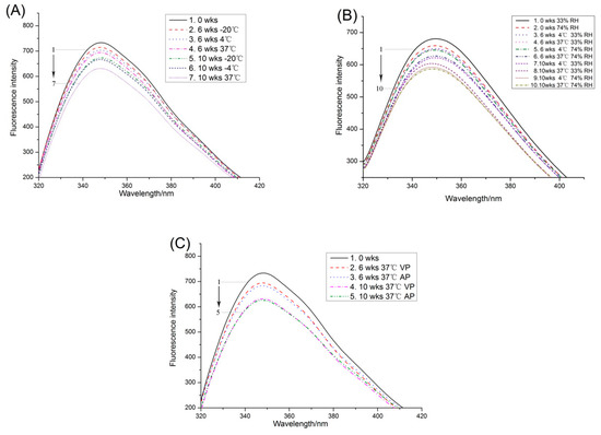 Changes in the intrinsic fluorescence spectra of PPI stored at different temperature (A), relative humidity (B) and packaging methods (C).