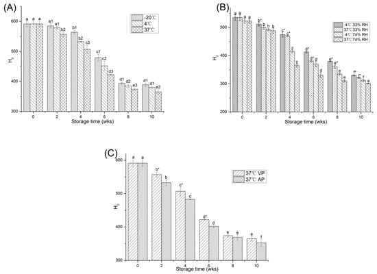 Changes in the H0 of PPI stored at different temperature (A), relative humidity (B) and packaging methods (C). a–f means the significant difference between the same treatments with different weeks (p < 0.05). 1–3 means the significant difference between the same weeks with different temperature (A) (p < 0.05). * means the significant difference between the same weeks and temperature with different relative humidity (B) or between the same weeks with different packaging methods (C) (p < 0.05).