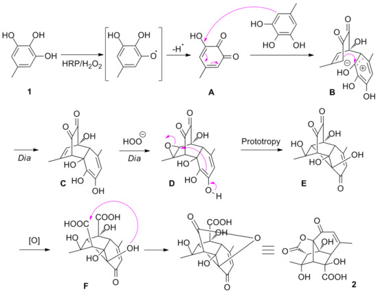 From a mechanistic point of view, we propose a series of oxidation/cyclisation to convert 1 into 2 (Scheme 4). Inspired by the reactivity of gallate derivatives in oxidative conditions [10], we hypothesised that substrate 1 could be slowly oxidised into the corresponding o-quinone A by HRP/H2O2, which could quickly react with unconverted 1 to yield intermediate B upon a vinylogous Michael addition followed ring closure by attack of the resulting enolate towards the arenium intermediate to form C in a distereoselective fashion. Epoxidation of the trisubstituted double bond by H2O2 present in excess in basic medium could then lead to D diastereoselectively. A subsequent regio- and stereoselective nucleophilic attack of an enol on the epoxide would then deliver E after prototropy. Upon oxidative cleavage of the α-diketone motif to F and subsequent lactonisation, product 2 would then be obtained, the oxidative cleavage possibly taking place earlier in the sequence.