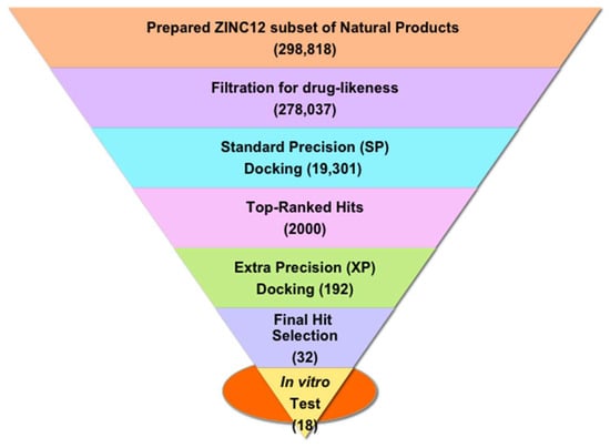 The workflow used for protein structure-based virtual screening in this study. The number of compounds obtained at each step of virtual screening is shown in parentheses.