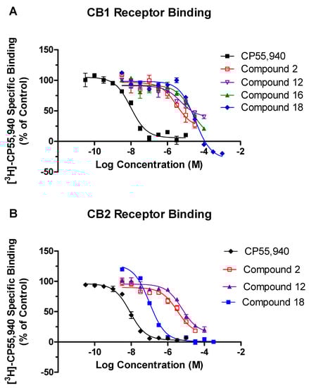 The binding displacement curves obtained for compounds 2, 12, 16, and 18 for the CB1 receptor (A) and CB2 receptor (B) in the cannabinoid radioligand binding assay. CP55,940 was used as a positive control.