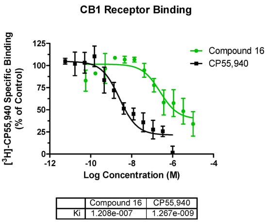 The binding displacement curves obtained when 16 was rescreened in the cannabinoid receptor 1 radioligand binding assay. CP55,940 was used as a positive control.