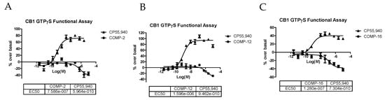 GTPγS functional curves for the CB1 receptor of compounds 2 (A), 12 (B), and 16 (C).
