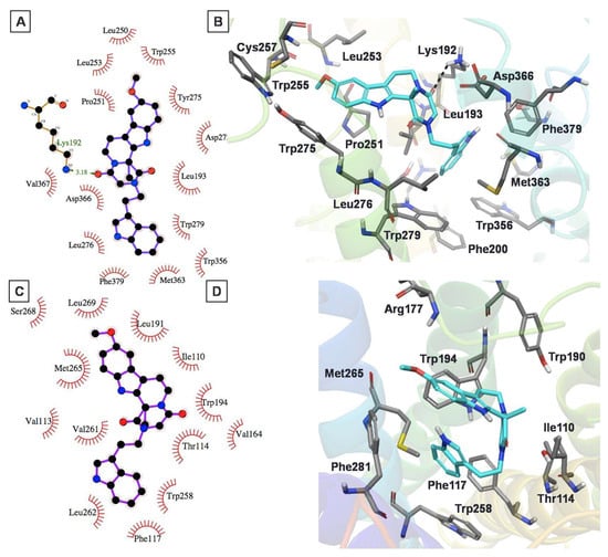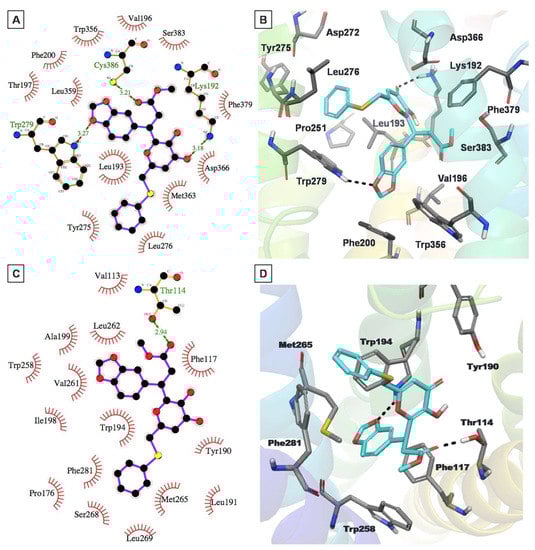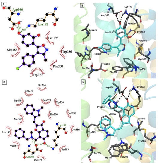 The putative binding mode for compound 2 into the CB1 (A,B) and CB2 (C,D) receptor models. Two-dimensional interaction views are shown on the left, while three-dimensional interaction views are shown on the right (ligand (cyan colored carbons) and protein binding site residues (dark grey colored carbons) are shown as sticks). The nonpolar hydrogens are not shown, for clarity.