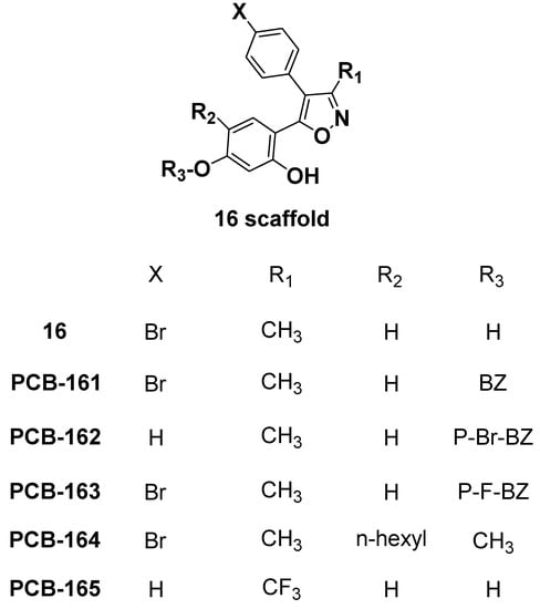 The functional CB1 GTPγS assays revealed that virtual screening hit compound 16 is a CB1 inverse agonist with a potent functional EC50 of 128 nM. We decided to search for available analogs of 16 and purchase them because 16 showed such promising nanomolar functional activity towards CB1. Our main goal of the exploration of analogs was to find more active and selective compounds for the CB1 receptor with higher polar surface area (to help limit CNS effects). We purchased five compounds which differed at the 5-hydroxyl group of the 1,5-dihydroxybenzene position of compound 16, and labeled them PCB-161 to PCB-165 (Figure 9).