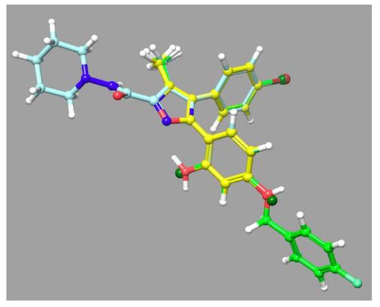 Interestingly, the n-hexyl substitution at the 4-position and the methoxyl at the 5-position resulted in PCB-164, which had high affinity for CB2 and was a CB2-selective compound (Ki = 0.1556 ± 0.0173 μM) (Table 2). These experimental results confirmed for the analogs of 16 that for CB1 activity and selectivity, the 4-bromophenyl moiety is necessary along with the p-fluorobenzyl group (PCB-163), while for CB2 activity and selectivity, n-hexyl substitution at the 4-position and the methoxy at the 5-position (PCB-164) are critical. We aligned compounds 16, 163, and well-known inverse agonist rimonabant to see the structural similarity between them (Figure 11). The 3D structures of rimonabant and PCB-16 and PCB-163 show some similarity. The methylpyrazole core in rimonabant is replaced by a methylisoxazole ring in PCB-16 and PCB-163. In addition, arms 1 and 2 of rimonabant (chlorophenyl and 1,3-dichlorophenyl groups) can serve as bioisosteres for the bromophenyl and 1,3-dihydroxyphenyl groups in PCB-16. The main differences between the structures is that arm 3 in rimonabant (piperidinyl carboxamide) is not present in PCB-16 and PCB-163. Instead, the p-fluorobenzyl moiety is attached to the analogous arm 2 (PCB-163). Only the pyrazole-3 carboxamide and the p-fluorobenzyl moiety (PCB-163) do not align well with rimonabant; otherwise, the rest of the core structures matched well in their 3D arrangement (Figure 11). The shape similarity score of compound 16 with rimonabant was calculated to be 0.75.