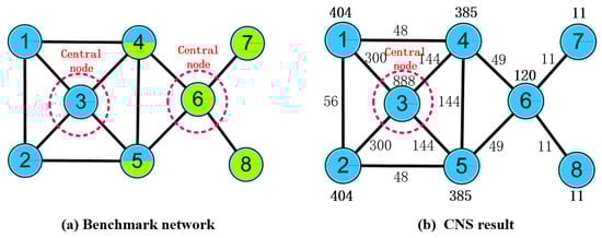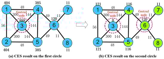 Considering the same demo network constructed in Section 2.2.2, more reasonable results can fortunately be achieved after recalculating the benchmark network (Figure 1a) with the CES algorithm. In the first circle, we calculate the value (Figure 3a), which is the same as the CNS results (Figure 1b), and regard node 3 as the first central node. Then the values of node 3’s neighboring nodes are revised (Figure 3b) according to the theory of CMI, which is introduced in the following Section 2.3.1. Hence, the other central node, node 6, can be selected, as a result of which the values of node 6’s neighboring nodes are smaller than node 6, and node1, node 2, node 4, and node 5 are not taken into account. Then, two overlapping nodes can be selected—node 4 and node 5. The result is the same as the benchmark network division (Figure 1a).